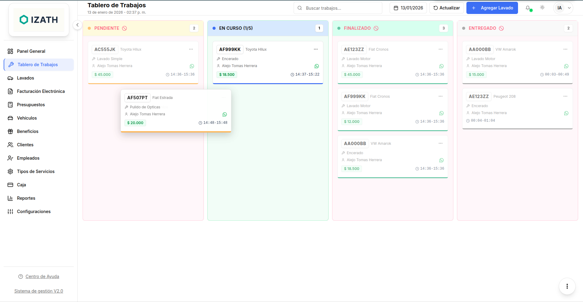 Gestión visual e intuitiva de todos los trabajos en planta. Arrastrá y soltá tarjetas para cambiar estados, visualizá tiempos de espera y organizá el flujo de autos en el lavadero en tiempo real para máxima eficiencia.